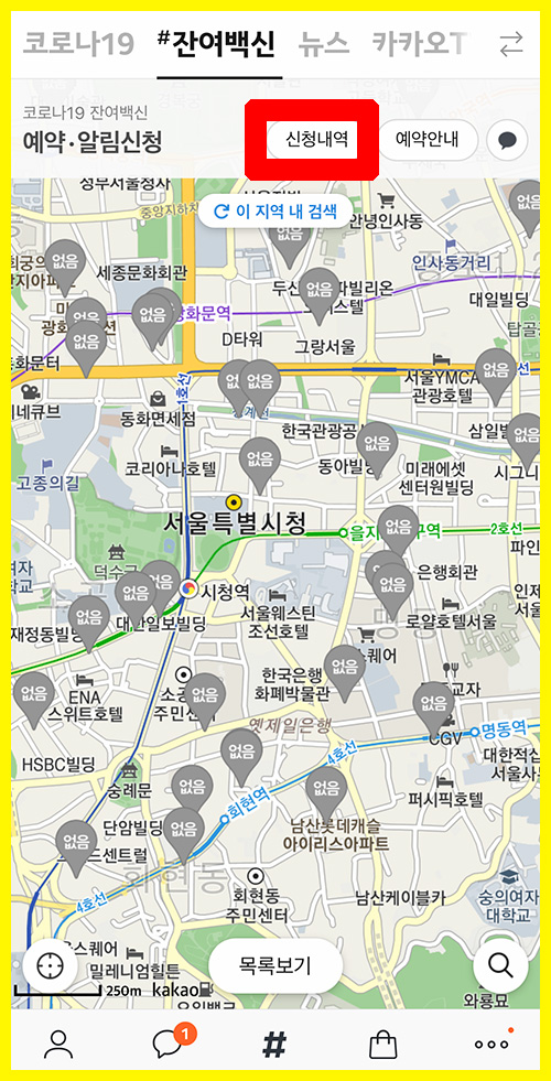 #잔여백신 부분 밑에 신청내역을 눌러주시면 신청한 병원을 확인할 수 있습니다.