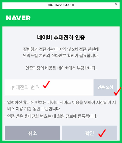 휴대전화 번호 입력하신 후에 인증 요청 하셔서 인증번호 입력하시고 확인 눌러주세요.