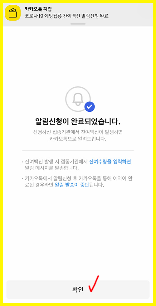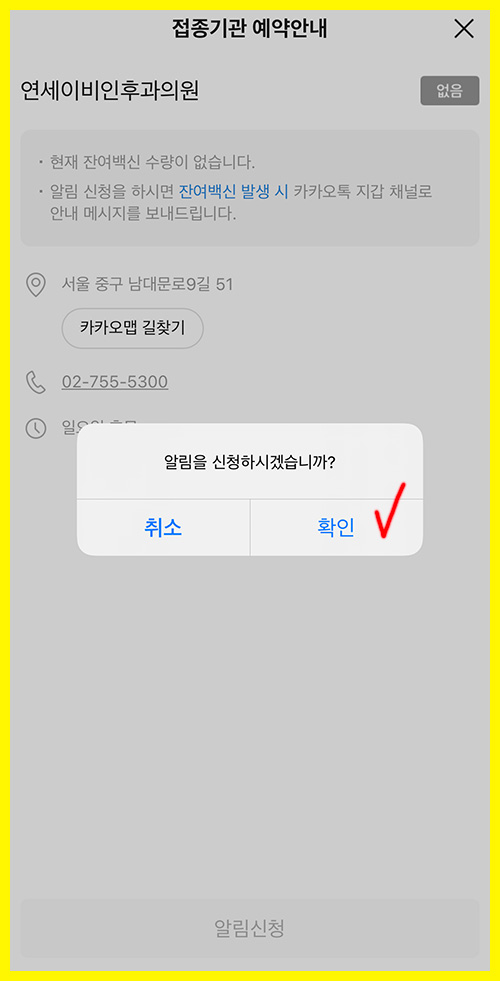 잔여백신 예약신청 원하는 병원이 맞는지 한 번 더 확인하시고 알림신청 버튼을 눌러주세요.