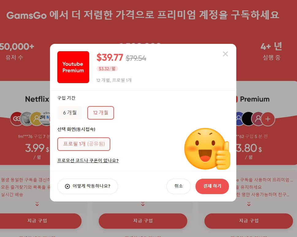 GAMSGO는 한국에서는 제공하지 않는 유튜브 가족 플랜을 이용한 서비스를 제공함으로, 사용자는 별도의 우회 방법 없이도 할인 혜택을 누릴 수 있습니다.