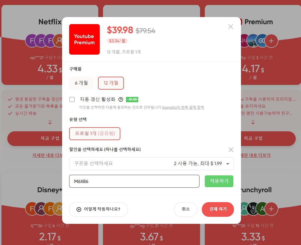 국가 인증 단속을 해결하는 방법은 바로 '겜스고'를 통해 유튜브 프리미엄을 가입하는 것 인데요. 우회 없이 정책에 해당 되지 않는 계정으로 가입이 가능하기 때문에 일일이 인증해야 할 필요 없이 유튜브 프리미엄을 저렴하게 이용할 수 있습니다.