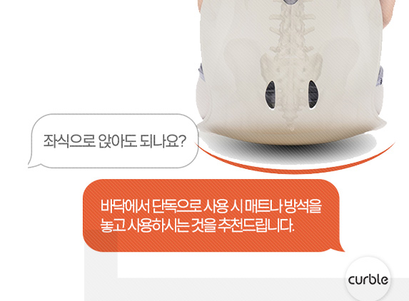 커블은 의자나 바닥에 두고 앉을 수 있게 만들어진 짧은 등받이가 있는 컨셉으로 엉덩이 부분에 쿠션에 착석하여 앉게 되면 등받이의 휘어진 부분이 허리를 밀어주면서 지지해주어 구부정하게 있지 못하도록 도움을 주는 일명 지렛대 원리라고 할 수 있습니다.