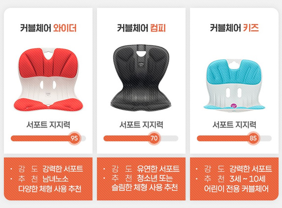 커블체어 와이더 컴피 둘다 마찬가지로 바른 자세를 유지하는 것에 도움을 주는 보조적인 역할의 도구일 뿐 의료기기처럼 체형을 교정시켜주는 것은 아닙니다.