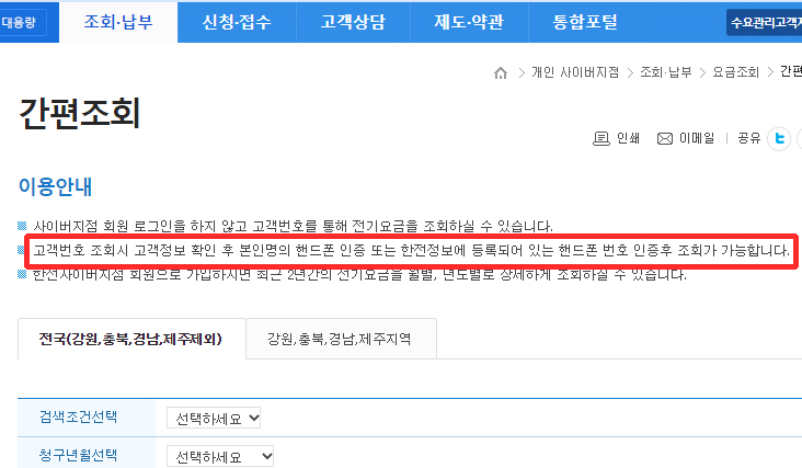 간편조회 메뉴에서 한전 고객번호를 따로 입력할 필요 없이