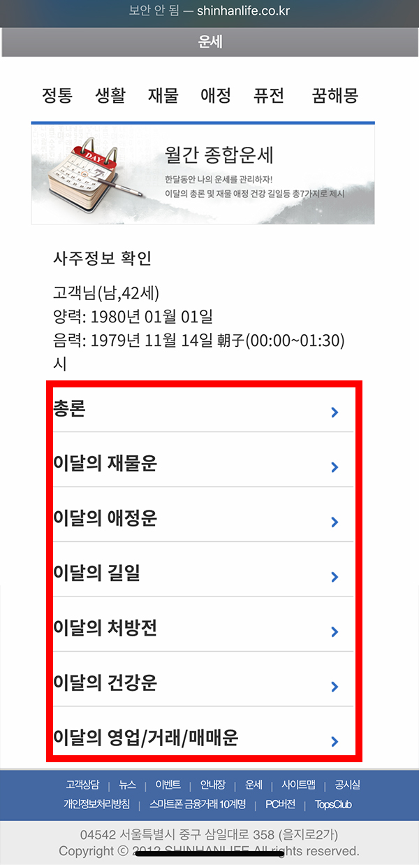 총론, 재물운, 애정운, 길일, 건강, 영업운등